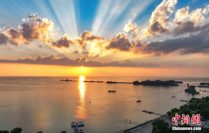 太湖湖滨国家湿地公园,蓝天碧水,湖光山色,呈现一幅人与自然和谐共生的美好画卷。中新社记者 泱波 摄