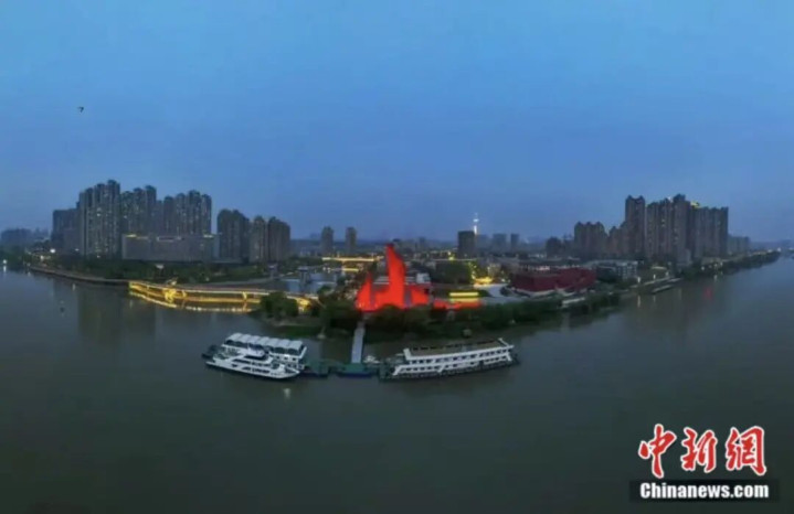 渡江胜利纪念馆红色的“千帆竞渡”群雕在暮色中分外醒目。中新社记者 泱波 摄
