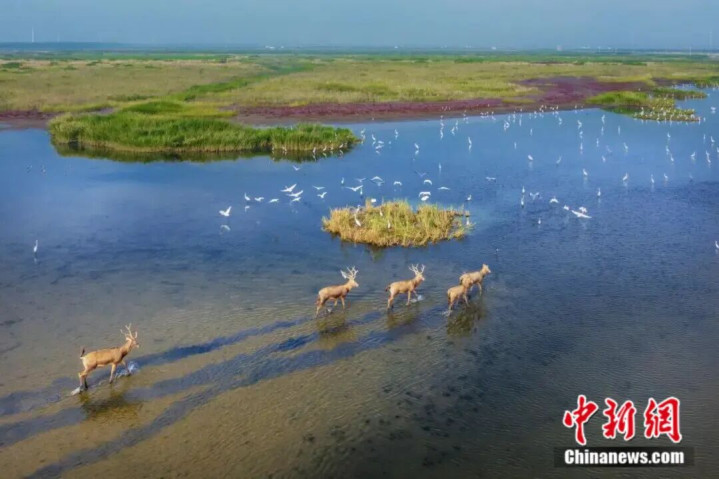 麋鹿和鸟儿在盐城的黄海湿地上休憩。盐城市委宣传部供图